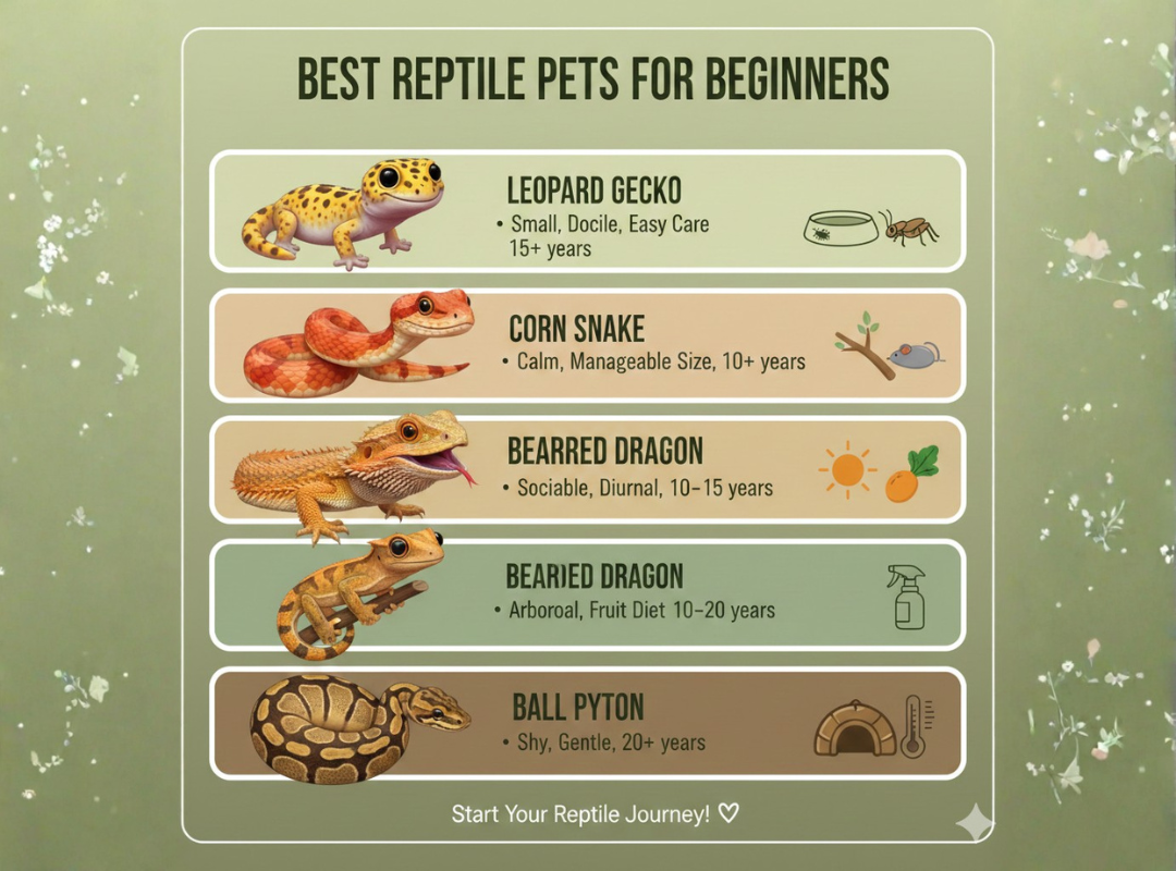 No matter which reptile you choose, start slow, learn their behavior, and enjoy the journey. Reptiles make wonderful, peaceful, and rewarding pets — especially for beginners.