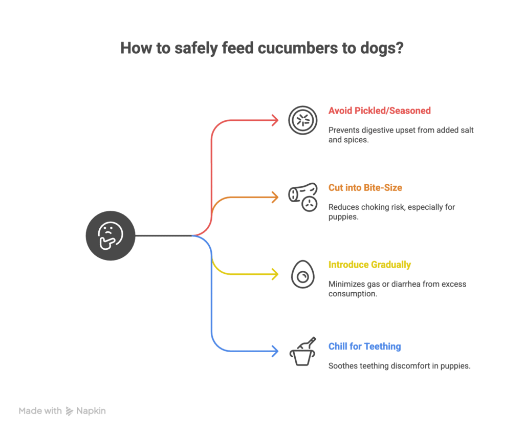 Dogs can have cucumbers regularly, but only in small amounts. Too much can cause mild stomach upset or gas. Always serve plain, bite-sized pieces.